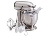 New from KitchenAid, the Custom Metallic stand mixer, in brushed nickel, adds a glistening prominence to your kitchen, with power and capacity to handle all your mixing, whisking and blending needs. The stand mixer has a 5-quart (or 9-cup flour) capacity, making it large enough for bread, cake and double batches of cookie dough. The stand mixer has the industry's best beater-to-bowl coverage - a 67-point planetary mixing action that reaches to the bowl's edges so every bit of batter is incorporated into the mix. Splattering is minimized with the pouring shield in place. The stand mixer is equipped with a high-performance, 325-watt motor, and comes with 10 speeds, offering versatility when mixing everything from stiff bread dough to egg whites. Its all-metal construction is sturdy and durable; the custom-plated finish is applied in five steps, helping to protect the stand mixer and offering lasting good looks. The tilt head design of the stand mixer lifts up for easier access to the spacious, all stainless work bowl. The work bowl has a contoured handle so it's easy to grasp. Included with your Custom Metallic stand mixer - a "C" dough hook, a dishwasher-safe, nylon coated flat beater and dough hook and a stainless steel wire whip..KitchenAid's Artisan stand mixer is a substantial piece of equipment: 325 watts of mixing power make child's play of creaming butter, kneading dough, and whipping cream. The kid in you will appreciate how quick and easy it is to mix up a batch of cookie dough. This model comes with three attachments: a flat beater for making batter, meat loaf, and all textures in-between; a wire whip for egg whites, mayonnaise, and more air-infused creations; and a hook for mixing and kneading yeast doughs. All three are solidly constructed and easily secured to the beater shaft with a simple twist. This model also includes a pouring shield for guiding ingredients to their proper destination, and the bowl itself locks tight to the base . Standing about 15 inches high, jutting out a foot, and weighing more than a grown woman's bowling ball, this stand mixer isn't the sort of appliance you'll wipe down and put away. Better to find a square foot of free counter space for easy access; besides, this machine is as pretty as it is rugged--you'll want to show it off. --Betsy DanheimFrom the Manufacturer